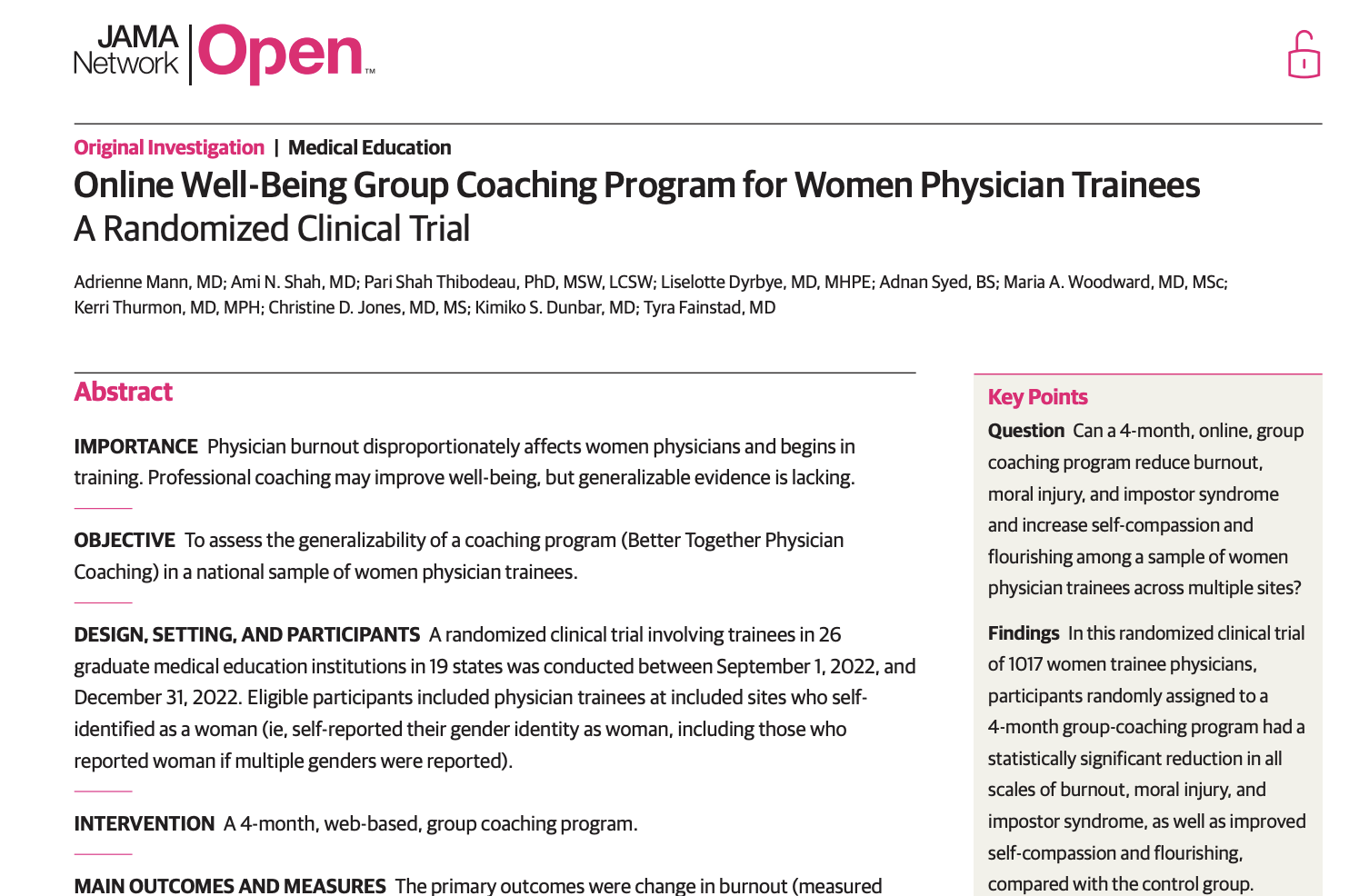 In a randomized clinical trial of 1017 women trainee physicians, participants randomly assigned to a group-coaching program had a statistically significant reduction in all scales of burnout, moral injury, and impostor syndrome, as well as improved self-compassion and flourishing, compared with the control group.